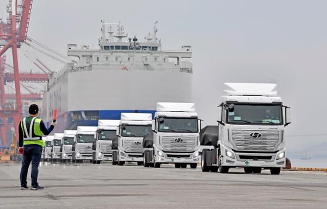 현대자동차가 2020년 7월 전남 광양시 광양항에서 세계 최초로 양산한 수소전기 대형트럭 '엑시언트 수소전기트럭' 10대를 선적하고 스위스로 수출했다. 사진은 엑시언트 수소전기트럭 10대를 스위스로 수출하기 위해 '글로비스 슈페리어'호에 선적하는 모습. 현대자동차 제공.