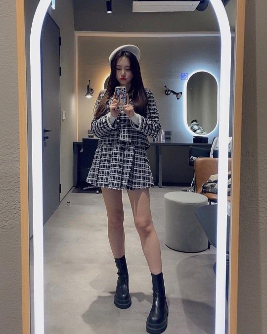 사진 속 송하예는 트위드 투피스에 베레모, 부츠를 매치해 세련된 룩을 연출했다. 송하예는 긴 생머리를 늘어뜨리고 청순한 미모를 자랑한다. 송하예는 입술을 살짝 내밀며 귀여운 표정을 짓고 있다. 송하예의 늘씬한 몸매가 부러움을 자아낸다.