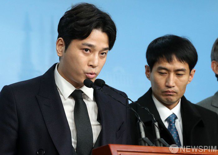 [서울=뉴스핌] 정일구 기자 = '버닝썬' 최초제보자인 김상교 씨가 10일 오후 서울 여의도 국회 정론관에서 통합신당 참여 지지 선언 기자회견을 하고 있다. 2020.02.10 mironj19@newspim.com