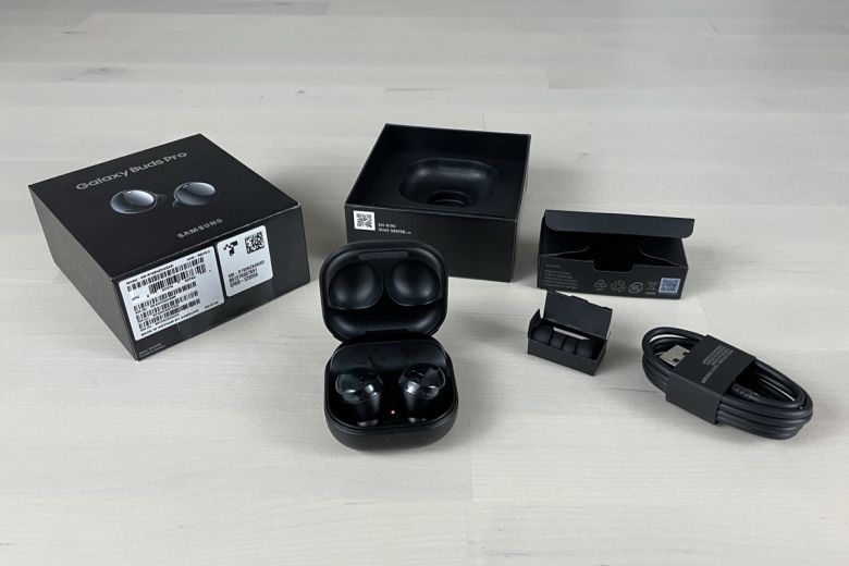 상자 안에는 갤럭시 버즈 프로가 충전 케이스(두께 약 2.5cm, 이어폰 포함 무게 약 57g)에 들어있고, USB-C-A 충전 케이블, 소/중/대 3가지 크기의 이어팁이 포함되어 있다.버즈 프로는 팬텀 바이올렛, 팬텀 블랙, 팬텀 실버의 3가지 색상으로 제공된다. 이번 리뷰에서는 팬텀 블랙을 사용했다. 삼성 갤럭시 버즈 라이브에 있던 귓바퀴에 꽂는 형태의 버드는 사라졌다. 대신 갤럭시 버즈 플러스처럼 광택 마감의 전통적인 형태를 되살렸다. 버드는 필자의 귀에 꼭 맞고, 살짝 튀어나왔을 뿐, 빠져나올 걱정은 없었다.