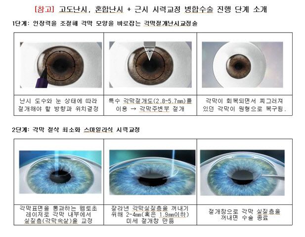 1단계 수술인 난시교정각막절개술(난시교정술)은 안과 수술용 미세나이프로 각막의 주변부를 살짝 절개해 가로 또는 세로로 길쭉한 타원형의 각막 모양을 동그랗게 바로잡는 특수기법이다. 각막 모양을 지탱하는 힘(인장력)을 미세하게 조정해 정확히 초점이 맺도록 굴절력을 복원하며, 각막이식 후 모양을 바로 잡을 때도 이 기술이 활용된다.