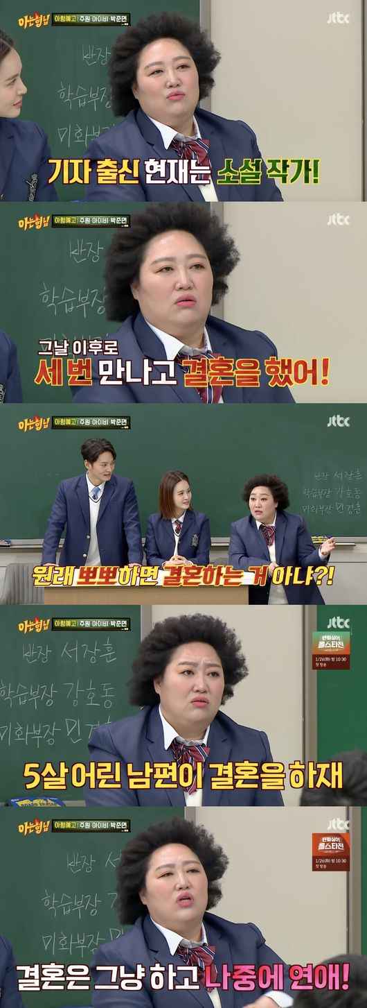 박준면은 남편과 3번 만나고 결혼했다고 밝혀 모두를 놀라게 했다. 그는 "남편이 기자를 오래 하다가 지금은 작가를 하고 있다. 남편이랑 기자 시절 인터뷰를 했는데 그 날 밥 먹고 세 번 만나고 결혼을 했다. 인터뷰하고 뽀뽀했다. 밥 먹고 술 마시고 술김에 뽀뽀했다. 원래 뽀뽀하면 결혼하는 거 아니냐"고 말해 웃음을 자아냈다.