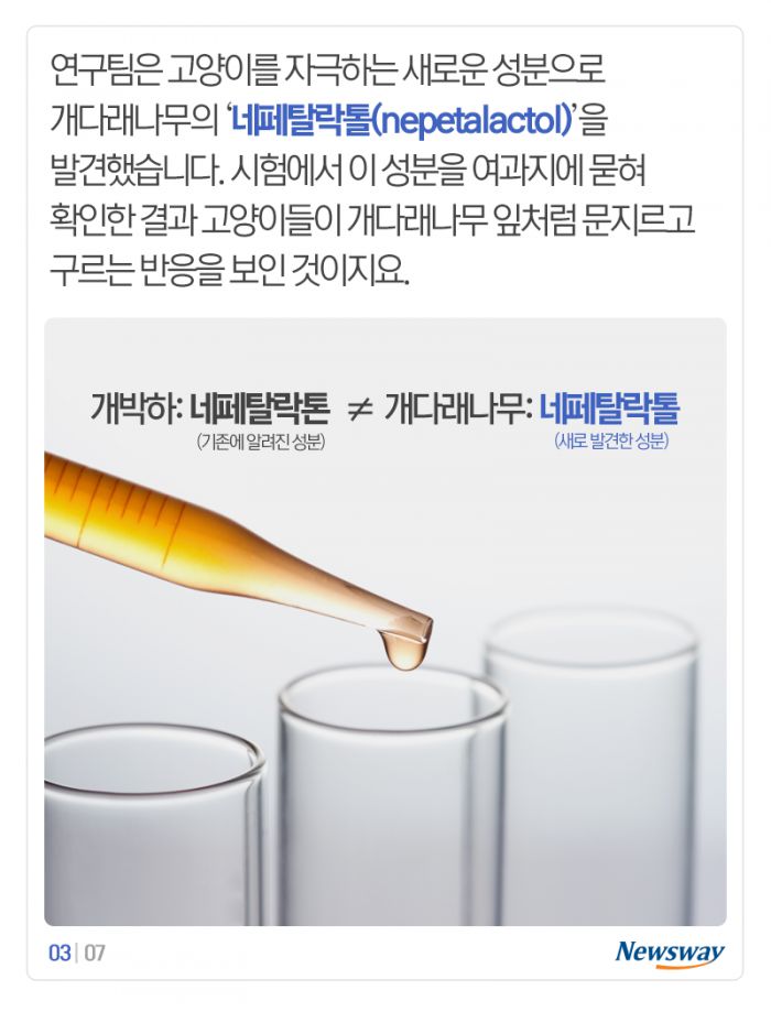 연구팀은 고양이를 자극하는 새로운 성분으로 개다래나무의 ‘네페탈락톨(nepetalactol)’을 발견했습니다. 시험에서 이 성분을 여과지에 묻혀 확인한 결과 고양이들이 개다래나무 잎처럼 문지르고 구르는 반응을 보인 것이지요.
