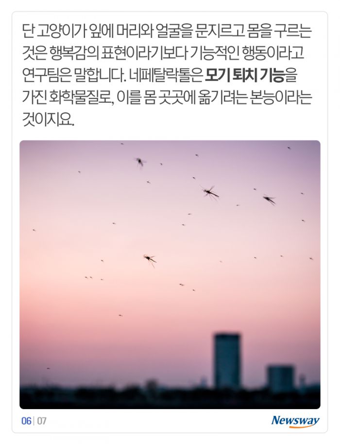 아마도 오랜 기간 모기와 전쟁하며 진화를 거친 고양이들이 자연스레 체득하게 된 지식이 아닐까 싶은데요. 그저 캣닙과 개다래나무가 너무 좋아서 그러는 줄만 알았던 고양이의 행동에는 또 다른 이유가 있었다는 사실. 참 흥미롭습니다.