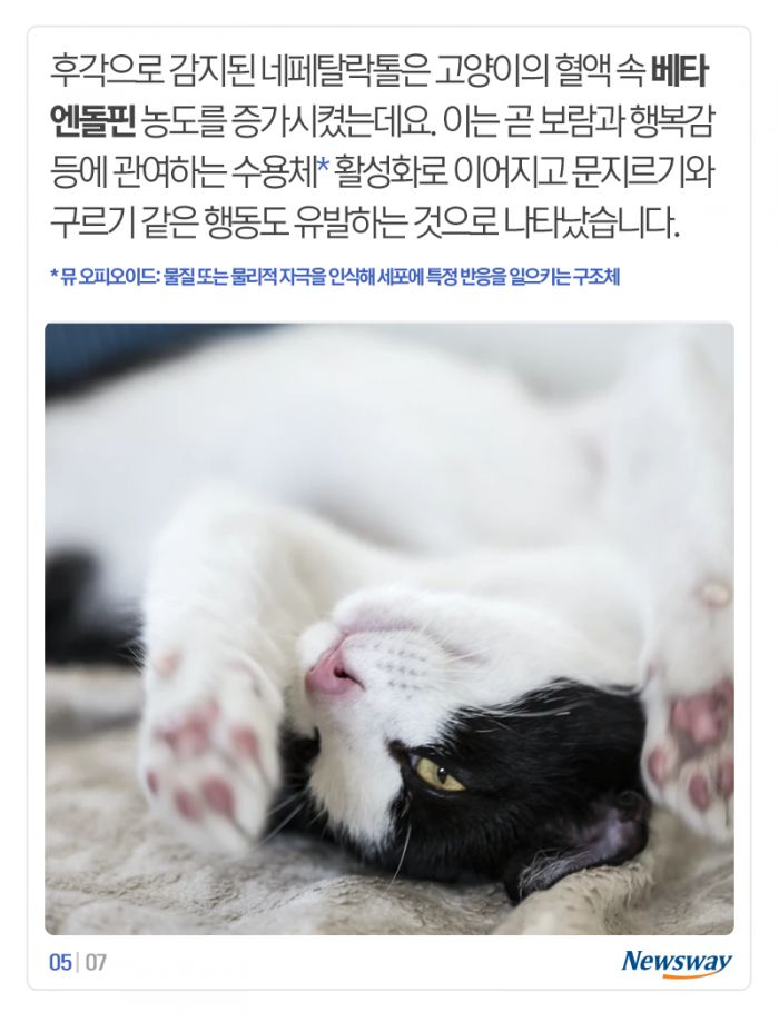 후각으로 감지된 네페탈락톨은 고양이의 혈액 속 베타 엔돌핀 농도를 증가시켰는데요. 이는 곧 보람과 행복감 등에 관여하는 수용체 활성화로 이어지고 문지르기와 구르기 같은 행동도 유발하는 것으로 나타났습니다.