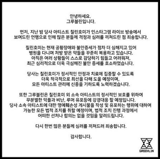이어 "그루블린은 칠린호미 외 소속 아티스트의 정서적인 본호를 위하여 무분별한 악플과 비난, 루머 유포 등에 강경대응 할 예정"이라며 "명예훼손성 게시물 작성 및 유포하는 행위에 대해 가능한 모든 법적 조치를 취할 예정이며, 법적 조치 진행과정에서 어떠한 선처나 합의는 없을 것"이라고 강조했다.
