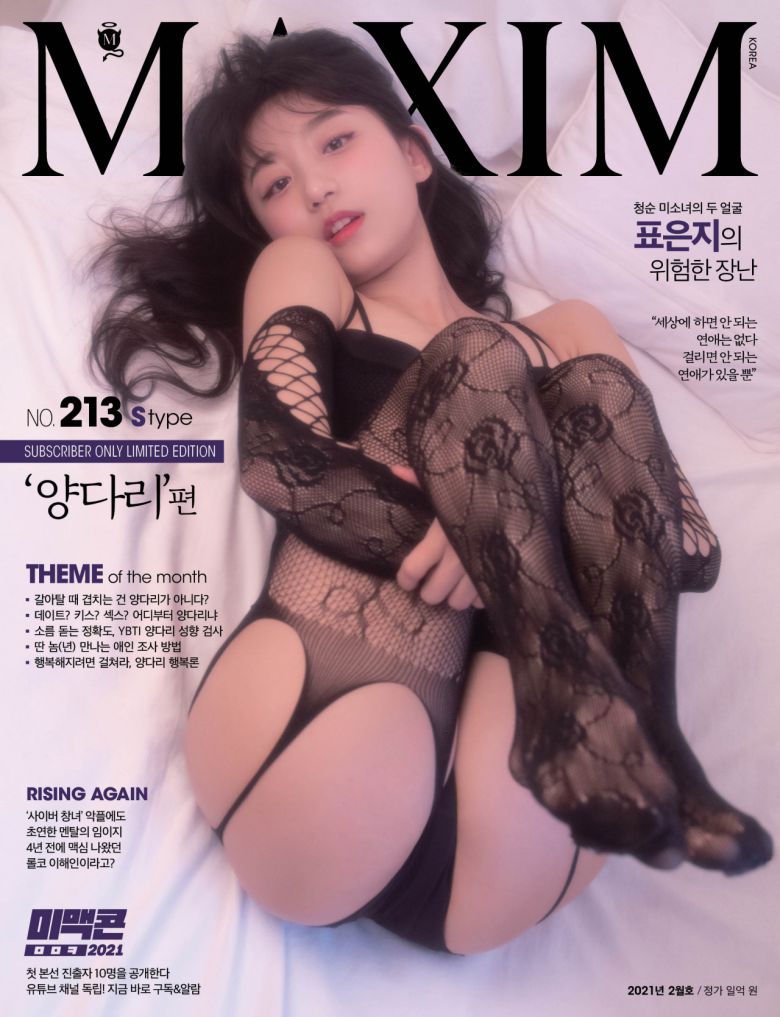 [스타데일리뉴스=천설화 기자] 남성지 맥심(MAXIM)이 인기 모델 표은지의 파격적인 정기구독자용 한정판 표지를 공개했다. 2021년 2월호 한정판 맥심 표지에서 표은지는 블랙 전신 망사 스타킹을 신고 있다.