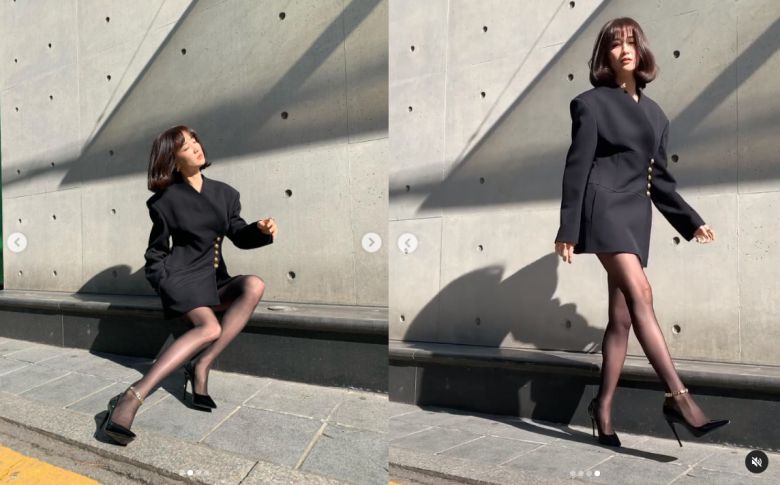 사진 속 그는 미니 원피스에 검은색 스타킹을 신고 포즈를 취하고 있다. 하이힐을 신어 더 도드라지는 각선미가 감탄을 부른다.
