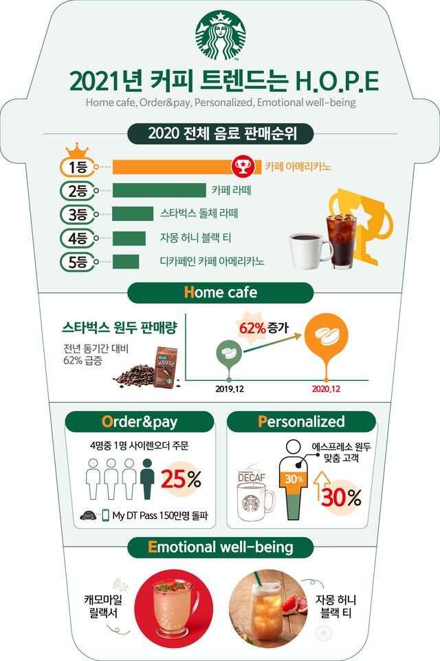 [서울=뉴시스] 최지윤 기자 = 스타벅스커피 코리아가 올해 커피 트렌드 키워드를 '호프'(H.O.P.E.)로 선정했다. '홈카페족' 증가(Home cafe), 비대면 소비 문화 확산(Order&pay), 맞춤 주문 음료(Personalized), 심리적 안정감(Emotional well-being)을 위한 메뉴를 찾는 트렌드가 지속될 것으로 보인다. IT 기술 개발을 통한 사이렌 오더와 DT 서비스 개선, 홈카페 상품군 강화, 개인화된 커피 음료 제공, 정서적 안정과 웰빙을 위한 메뉴 개발을 이어갈 계획이다.