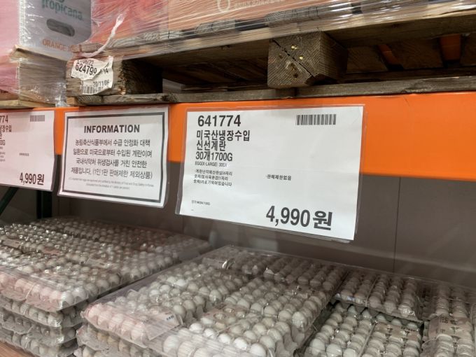 7일 유통업계 등에 따르면 창고형 할인매장 코스트코는 지난주 중반 미국산 계란 판매를 시작했다. 1판(30개)에 4990원으로 기존 판매되던 국내산 계란(5990원)가격에 비해 17% 가량 저렴하다. 대형마트, 전통시장 등 평균 유통가격 대비로는 30% 가량 낮은 수준이다.