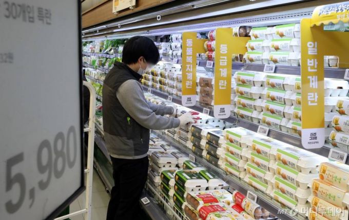 고병원성 조류인플루엔자(AI)의 확산으로 계란 값이 상승하고 있는 가운데 11일 서울 시내 한 마트에서 직원이 계란을 정리하고 있다. / 사진=이기범 기자 leekb@ |