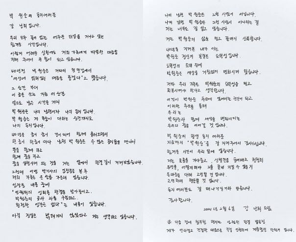 8일 박원순을 기억하는 사람들(이하 박기사) 관계자는 이데일리와 통화에서 “현재 온라인상에서 빠르게 퍼지고 있는 강난희 여사의 편지글은 본인이 직접 쓴 글이 맞다”며 “박기사 측에 전달된 편지 글을 공유하는 과정에서 외부로 유출됐다”고 말했다.