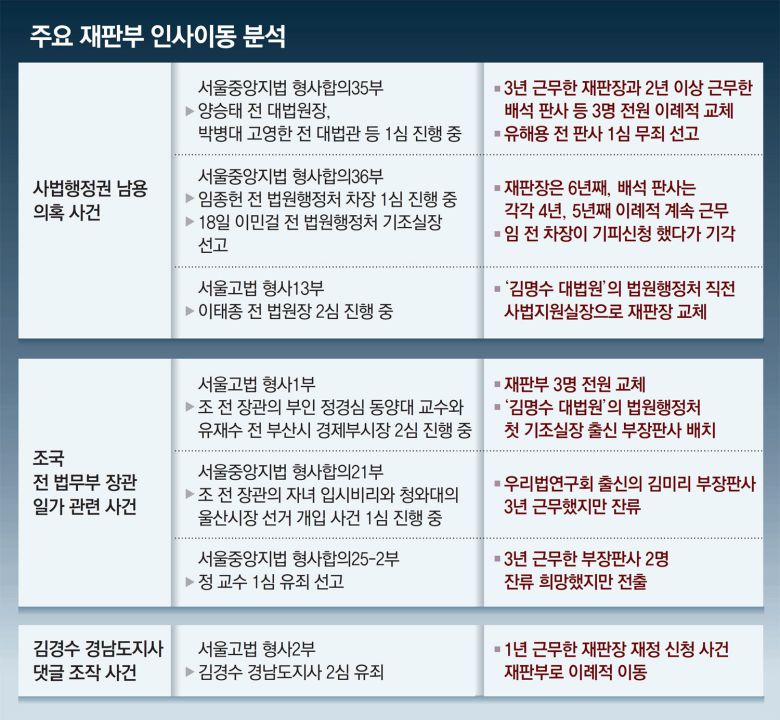 반면 양승태 전 대법원장 사건을 맡은 재판부에는 원칙이 적용됐다. 재판장인 박남천 부장판사는 서울중앙지법에서 3년 근무했고 배석 판사들도 2년 이상 근무해 모두 전보됐다. 박 부장판사는 지난해 1월 사법행정권 남용 혐의로 재판에 넘겨진 유해용 전 대법원 수석재판연구관에게 무죄를 선고했다. 사법행정권 남용 의혹으로 기소된 이태종 전 서울서부지법원장의 2심 재판장도 변경됐다. 신임 재판장에는 직전에 법원행정처 사법지원실장으로 근무하던 최수환 서울고법 부장판사가 배치됐다. 이 전 법원장은 1심에서 무죄를 선고받았다.