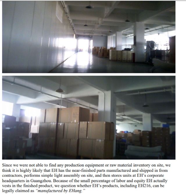뿐만 아니라 이항 본사도 최소한의 보안 시설도 갖추지 않았으며 드론택시 생산을 위한 기초적인 조립라인도 없었다고 꼬집었다. 설계 및 테스트 센터는 헬기가 이착륙할 수 있는 넓은 공간만 있었다고 한다.