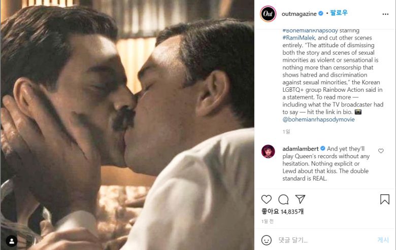 영화 ‘보헤미안 랩소디’에서 동성 간 키스 장면을 삭제한데 대해 미국 매거진 ‘아웃’이 관련 논란을 전했다. SNS 캡처