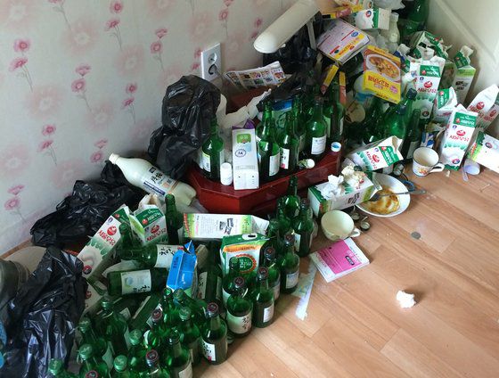 특수청소부 길해용(36)씨가 고독사 청소업무를 위해 방문한 현장의 모습. 셀 수 없이 많은 소주병들이 모여있다. 길해용씨 제공