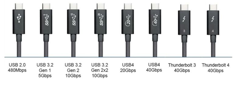 미니 디스플레이포트(DisplayPort) 커넥터를 사용한 썬더볼트 1.0과 썬더볼트 2를 무시하면, 썬더볼트 3(T3)은 USB-C와 똑같아 보이지만, 40Gbps(5GBps = 5,000MBps = 40,000Mbps) 속도로 훨씬 빠르며 성능이 더 뛰어나다. 썬더볼트는 하드 드라이브와 SSD, 그래픽 카드용 PCI 익스프레스 데이터와 디스플레이포트 기능을 하나의 케이블로 제공한다.