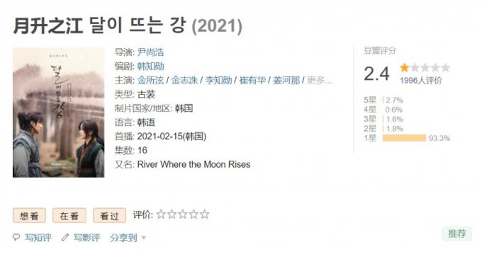 실제로 한국시간으로 26일 오후 4시 기준 중국의 최대 평론 사이트인 도우반에서 달이 뜨는 강의 평점이 별 5개 중에서 1.2개를 기록하고 있다. 10점 만점으로 치면 2.4점이다. 1996명의 중국 누리꾼이 참여했으며 대다수인 93.3%가 별 1개를 줬다. 뒤이어 2개는 1.8%, 3개는 1.6%, 4개는 0.6%, 5개는 2.7%였다.