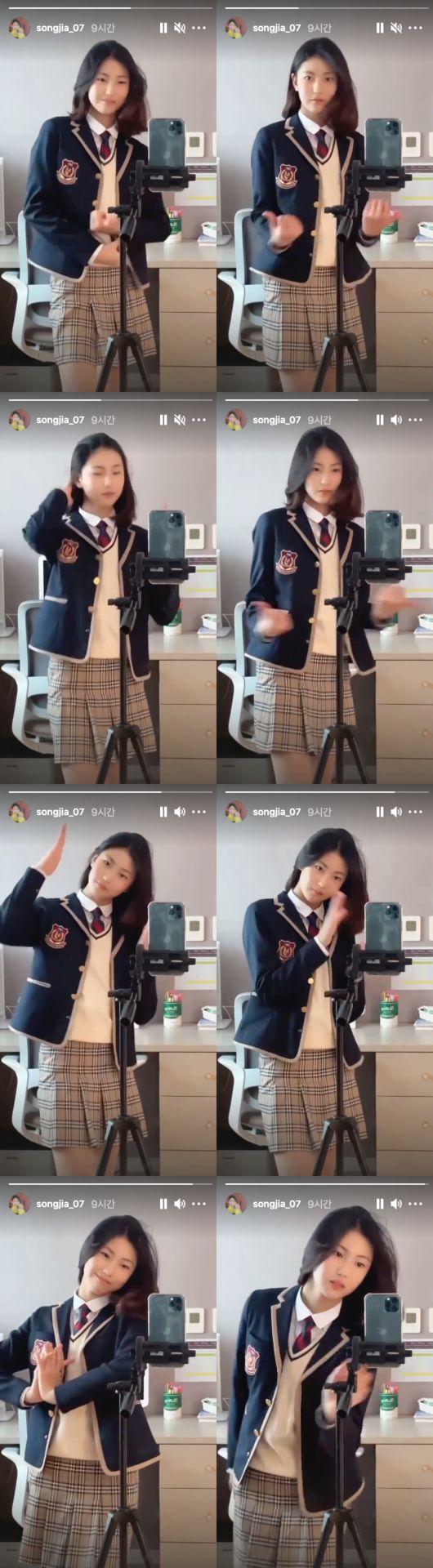 송지아는 1일 자신의 인스타그램 스토리에 영상 하나를 올렸다. 영상에서 그는 교복을 입고서 자신의 방에서 댄스 영상을 찍고 있다.