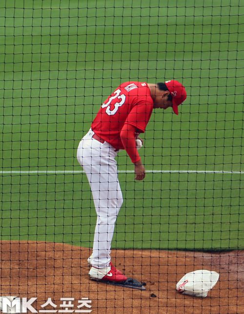 김광현이 불펜 워밍업전에 스파이크를 털고 있다. 사진(美 주피터)= 김재호 특파원 |