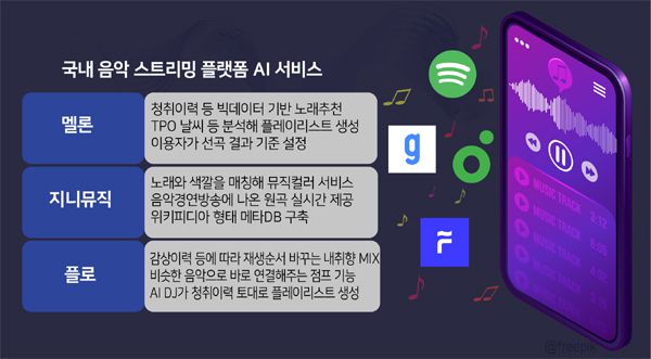 SK텔레콤 계열의 음악 플랫폼인 플로도 AI 서비스를 대폭 강화하고 있다. 플로는 지난달 '구석구석 개인화'를 주제로 대대적인 업데이트를 진행하며 새 기능을 추가했다. AI DJ '누구(NUGU)'가 이용자의 청취 이력을 바탕으로 비슷한 곡을 다양하게 추천하면서 플레이리스트를 거의 무한대로 만들어주는 '점프(JUMP)' 기능을 홈 화면에 배치했다. 플레이리스트 곡들의 재생 순서를 이용자 취향에 맞춰 바꿔주는 '내 취향 믹스(mix)'도 강화했다. 점프와 내 취향 믹스는 스포티파이에 없는 서비스다. 플로는 또 이용자가 보관함 속에 저장해 둔 곡이나 장르를 기반으로 한 '보관함 추천'에 '작년에 많이 들은 곡'을 추가했다.