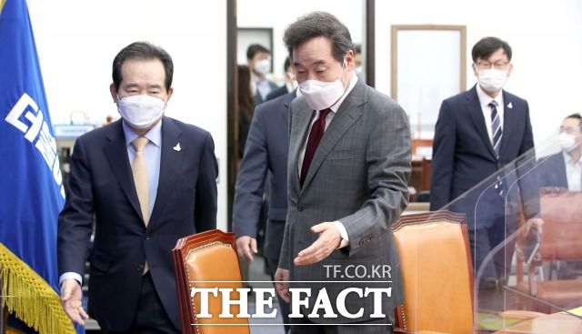 LH 사태가 터진 이후 변창흠 국토교통부 장관 책임론에 무게를 뒀던 이낙연 더불어민주당 상임선대위원장, 정세균 국무총리가 변 장관 사퇴로 존재감을 키웠다. 지난 2020년 9월 24일 고위당정청 협의회에 참석하는 정 총리와 이 위원장. /이새롬 기자 |