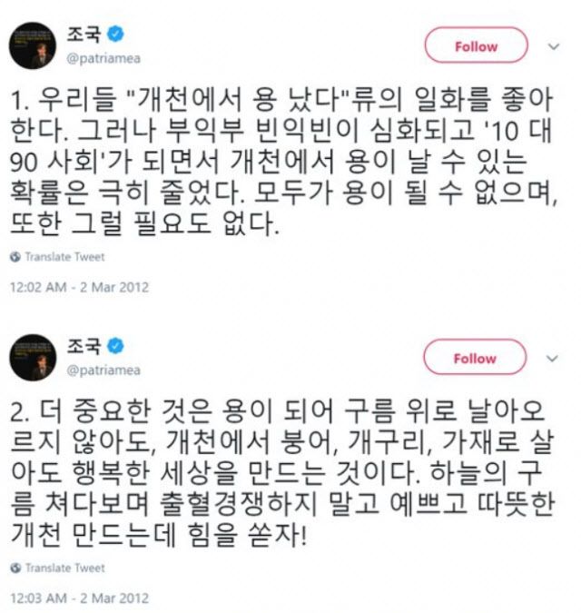 조 전 장관은 당시 “우리들 ‘개천에서 용 났다’류의 일화를 좋아한다. 그러나 부익부 빈익빈이 심화하고 ‘10대 90 사회’가 되면서 개천에서 용이 날 수 있는 확률은 극히 줄었다. 모두가 용이 될 수 없으며 또한 그럴 필요도 없다”고 했다.