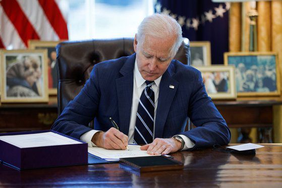 조 바이든 미국 대통령이 지난 11일(현지시간) '미국인 구조 계획'이라고 명명한 경기 부양안에 서명하고 있다. [로이터=연합뉴스] |