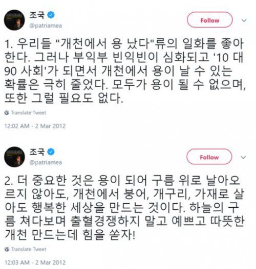 당시 조 전 장관은 “더 중요한 것은 용이 되어 구름 위로 날아오르지 않아도, 개천에서 붕어·개구리·가재로 살아도 행복한 세상을 만드는 것”이라며 “하늘의 구름 쳐다보며 출혈경쟁하지 말고 예쁘고 따뜻한 개천 만드는 데 힘을 쏟자”고 글을 남긴 바 있다.