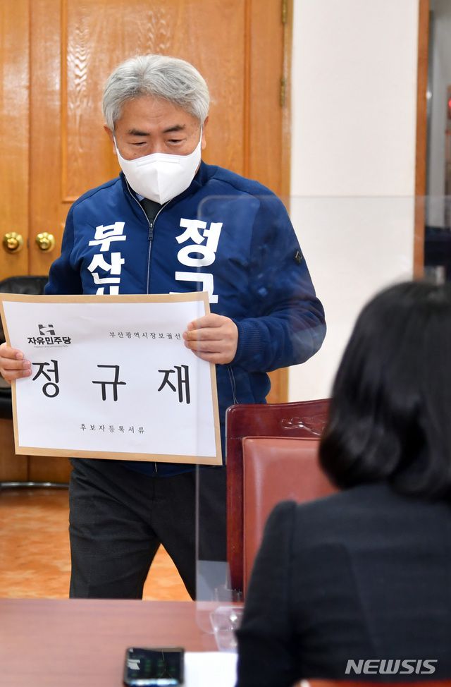 [부산=뉴시스] 하경민 기자 = 부산시장 보궐선거 자유민주당 정규재 후보가 18일 오전 부산 연제구 부산시선거관리위원회에서 후보자등록신청을 하고 있다. 2021.03.18. yulnetphoto@newsis.com