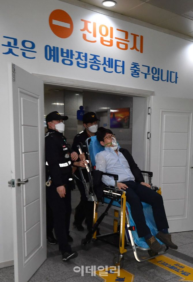 [이데일리 김태형 기자] 18일 서울 성동구청에 마련된 '서울시 1호' 코로나19 예방접종센터에서 열린 백신 접종 모의훈련에서 아낙필라시스 긴급환자를 이송하는 훈련이 진행되고 있다.