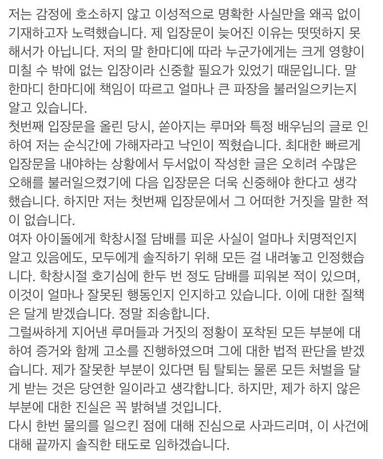 먼저 이번 일로 심려를 끼친 모든 분들께 진심으로 죄송한 마음을 전합니다. 저에 대한 많은 루머 및 각 폭로에 대한 저의 입장을 말해보려 합니다.