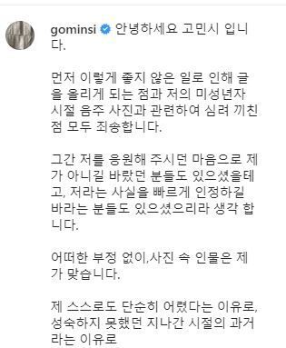 20일 고민시는 자신의 인스타그램에 “이렇게 좋지 않은 일로 인해 글을 올리게 되는 점과 저의 미성년자 시절 음주 사진과 관련하여 심려 끼친 점 모두 죄송합니다”라는 사과문을 올렸다.
