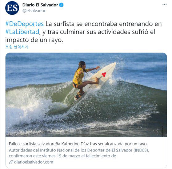 21일(현지시간) NBC 등에 따르면 엘살바도르 서핑 선수인 캐서린 디아스 에르난데스(22)가 지난 19일 집 근처 엘퉁코의 태평양 해변에서 서핑 훈련을 하다 번개에 맞았다.