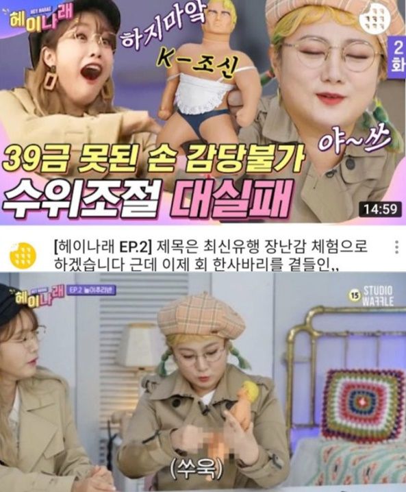 박나래는 속옷만 입은 인형을 두고 "요즘 애들은 되바라졌다" "아, 그것까지 있는 줄 알았지" 등 수위 높은 발언을 했다. 또 인형의 손으로 신체 주요부위를 가리는 모양을 만들자 제작직은 '(조신)K-매너' 자막을 달았다.