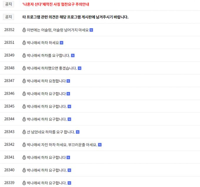 박나래가 발언에 대한 비판에 직접 사과하고 자숙해야 한다는 여론도 커지고 있다. 출연 중인 MBC 예능 '나혼자 산다' 시청자 의견 게시판에는 "박나래의 하차를 요구한다"는 글이 200건 가까이 올라왔다.