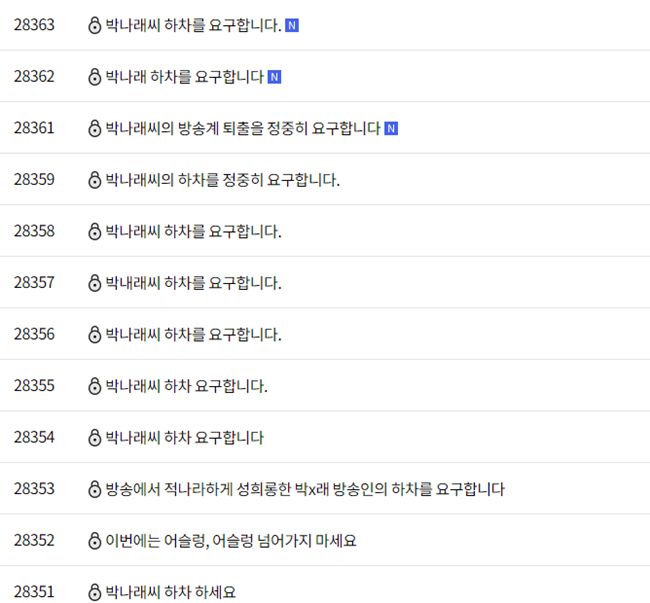 '나 혼자 산다' 시청자 게시판을 비롯한 온라인 커뮤니티 등에는 "박나래 하차해라", "사과하고 자숙해라", "'나 혼자 산다'에서 내보내라", "책임감있는 사과와 하차를 원한다" 등 비판 글들이 올라오고 있다.