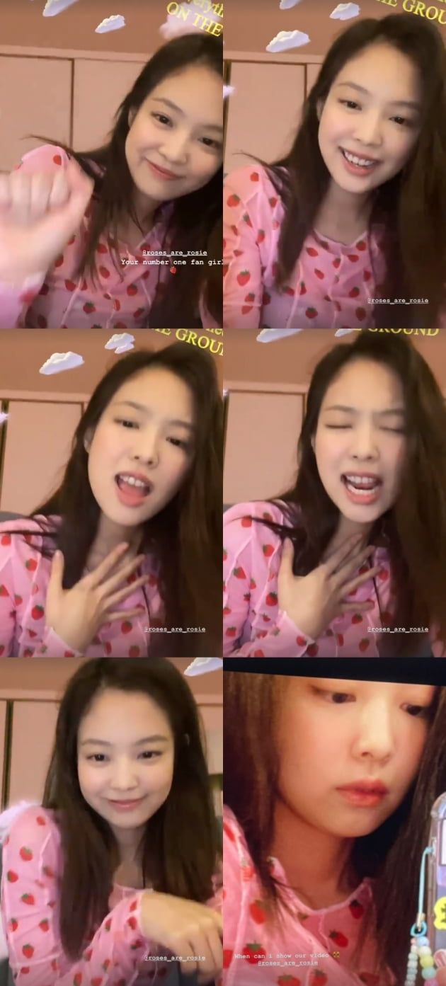 제니는 29일 자신의 인스타그램을 통해 로제를 응원하는 짧은 영상을 게재했다. 사진에서 딸기 잠옷을 입은 제니는 '온 더 그라운드'를 부르는데 심취한 열정적인 모습이라 웃음을 줬다. 특히, 평소 럭셔리 착장을 선보여왔던 제니는 딸기 모양이 프린트된 잠옷을 입은 채 노래를 불러 눈길을 끌었다.