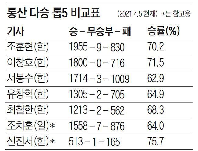 한국 2위 겸 세계 2위가 이창호다. 통산 1800승(716패·승률 71.5%)으로 조훈현과 155승 차다. 조훈현의 최초 2000승 고지 등정이 가능할지, 이창호가 스승을 추월할 수 있을지, 그 시점은 각각 언제쯤일지 등으로 관심사가 모아진다. 역대 최다승 3위 서봉수(68)는 1714승으로 추격권 안에 있지만 연령상 따라잡기 힘들어 보인다.