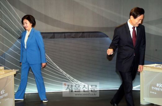 4·7 서울시장 보궐선거를 이틀 앞둔 5일 더불어민주당 박영선(왼쪽) 후보와 국민의힘 오세훈 후보가 방송기자클럽 초청 토론회에서 기념촬영을 마치고 각자 자리로 걸어가고 있다.정연호 기자 tpgod@seoul.co.kr |