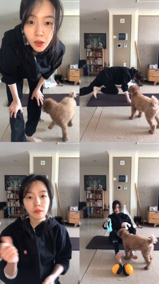 6일 방민아는 자신의 인스타그램 계정을 통해 라이브 방송을 진행했다. 방민아는 매트를 깔고 반려견들과 함께 운동을 시도했다.