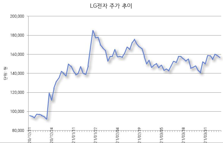 실제 주가 움직임도 살펴볼까요? 지난해 말 LG전자의 주가는 10만 원 아래였습니다. 그러다가 지난해 12월 23일 전기차 부품을 생산하는 합작법인을 설립한다고 발표하자 상한가를 기록했고요. 상승세를 타던 주가가 날개를 단 건 1월 20일이었습니다. 권봉석 LG전자 사장이 임직원에게 모든 가능성을 열어두고 검토 중이라며, 모바일 사업 철수를 시사했거든요. 당일 LG전자 주가는 13% 가까이 폭등했습니다. 이후 지지부진한 흐름이 이어지고 있긴 하지만, 지난해와 비교하면 크게 오른 주가라는 점에는 이견이 없어 보입니다.