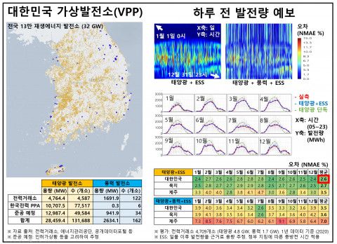 대한민국 가상 발전소는 현재 전국에서 가동되고 있는 재생 에너지 발전소 8만개와 준공 예정 5만개까지 총 13만개 발전소(총 32GW 규모)를 가상 발전소(Virtual Power Plant)로 만든 것이다. 하루 전에 시간대별 발전량을 예측하고, 발전소 집합을 최적화해 예측 오차를 줄여준다.