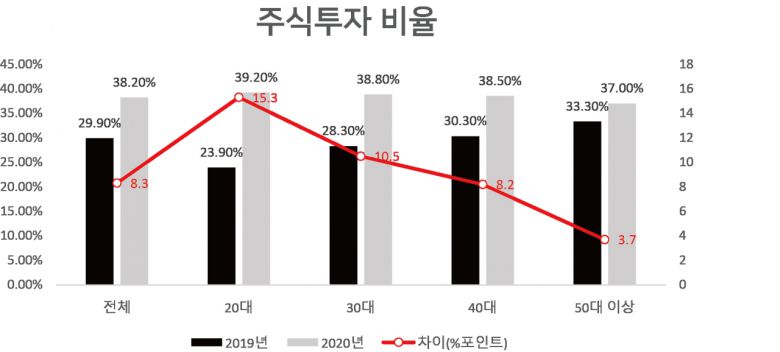 이 가운데 20대 주식투자 비율이 1년 만에 15.3%p 증가하며 39.2%를 기록했다. 2019년 전 연령대에서 가장 낮은 주식투자비율(23.9%)를 보였던 20대가 올해는 가장 높은 주식투자비율을 나타냈다. 같은 기간 30대 주식투자 비율은 10.5%p, 40대 8.2%p, 50대 이상이 3.7%P 늘었다.