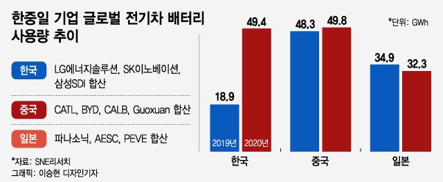 중국 기업 역시 막대한 규모의 중국 내수 시장을 선점한 효과로 지난해 설치량이 49.8GWh를 기록하며 전년 사용량 48.3GWh 대비 소폭 시장 확대에 성공했다. 반면 파나소닉, AESC(오토모티브 에너지 서플라이), PEVE(프라임어스 EV 에너지) 등 일본 기업의 사용량은 32.3GWh로 전년의 34.9GWh 대비 역성장했다. 일본 배터리 업계로서는 긴장할 수밖에 없는 상황인 것이다.