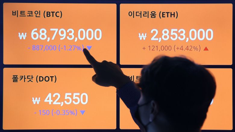 비트코인 가격이 7천만원 밑으로 하락한 21일 오후 서울 강남구 빗썸 강남고객센터 모니터에 비트코인 시세가 표시되고 있다.[사진 출처 = 연합 뉴스]