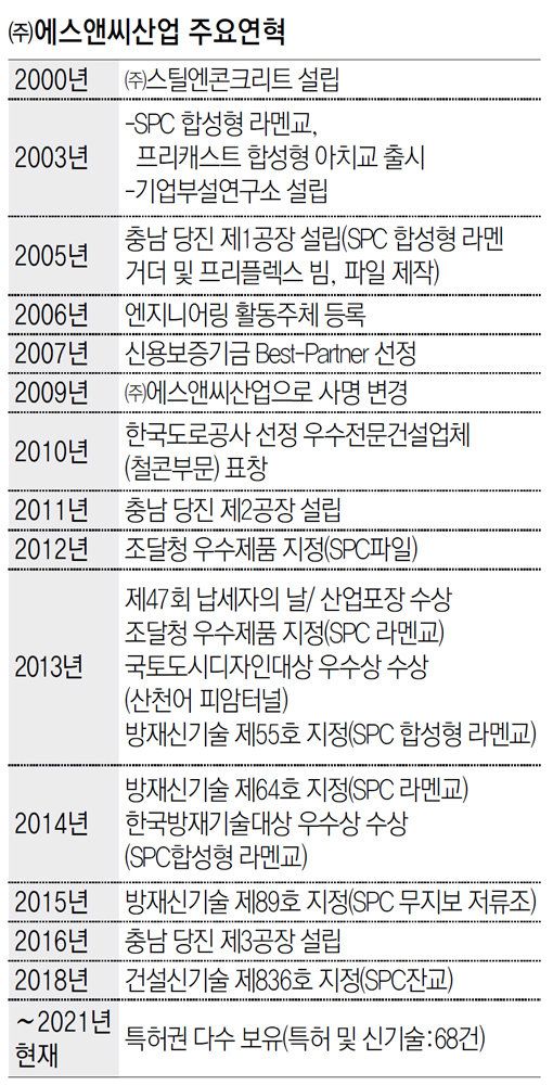 교량은 단순히 떨어져 있는 지역을 연결하는 ‘다리’의 역할을 넘어 물류의 혁신을 가져왔다. 그 결과 세계 경제와 산업발전에도 큰 영향을 줬다. 교량 전문기업 ㈜에스앤씨산업은 국내 교량 산업발전에 한 획을 긋고 독자적인 영역을 확보한 기업이다. 2000년 8월 프리플렉스 합성형 거더 공법으로 특허 교량 사업을 시작한 ㈜에스앤씨산업은 합성형 라멘교(상판과 보, 교각을 일체형으로 지은 다리)와 조립식 잔교(접안시설)를 개발해 상업화하면서 국내 관련 시장을 개척했다. 뛰어난 경제성과 기술 수준으로 사업은 급속도로 성장했고 현재 국내 교량업계를 대표하는 기업으로 거듭났다.
