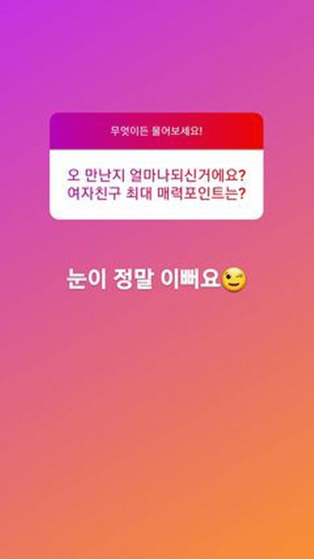 여자친구에 대해서는 "작은 것에 행복할 줄 아는 멋진 사람", "눈이 정말 예쁘다", "매운 거 잘 못 먹을 것 같은데 잘 먹는다고 얘기할 때 사랑스럽다", "눈이 예쁘다"라며 애정을 드러냈다.