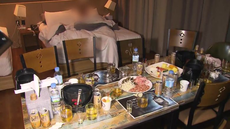 같은 건물 위층에 있는 모텔 방에 들어가 봤더니, 술병과 안주들이 널브러져 있습니다.