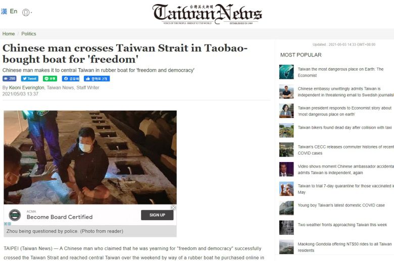 2일 CNN에 따르면 대만 경찰은 지난 1일 저우라는 성의 중국 남성이 대만해협을 작은 고무보트를 타고 건너 왔다고 발표했다.